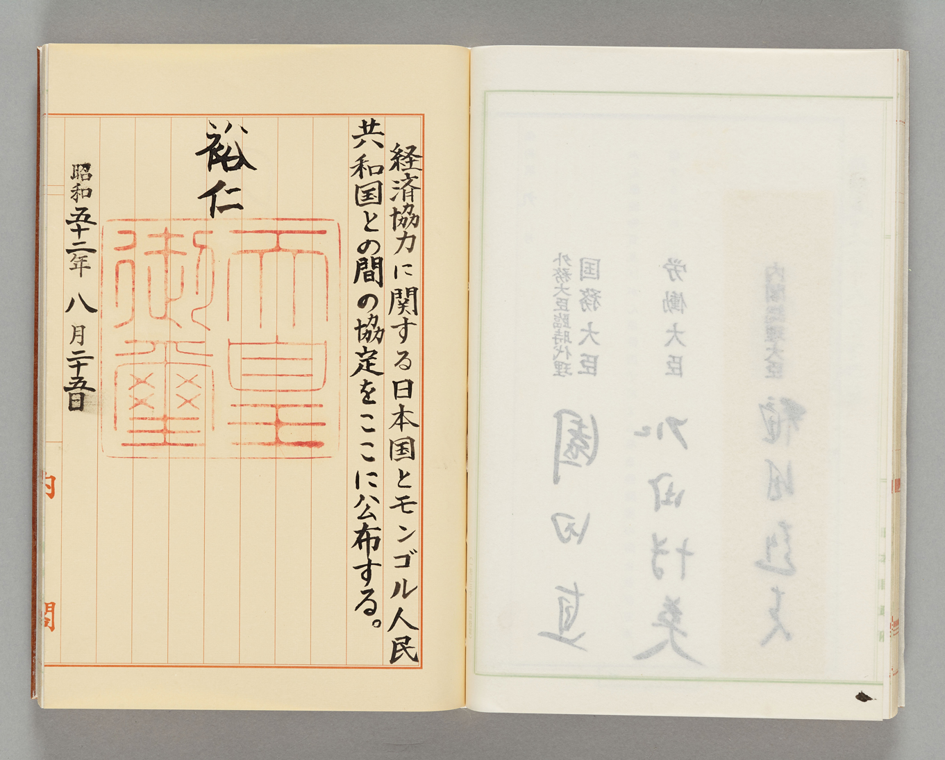 昭和52(1977)年3月17日に調印された日本とモンゴルの経済協力に関する協定について、8月25日に御署名原本が公布されました。