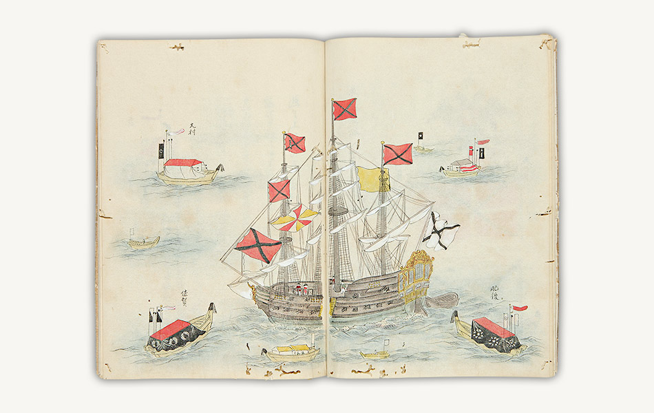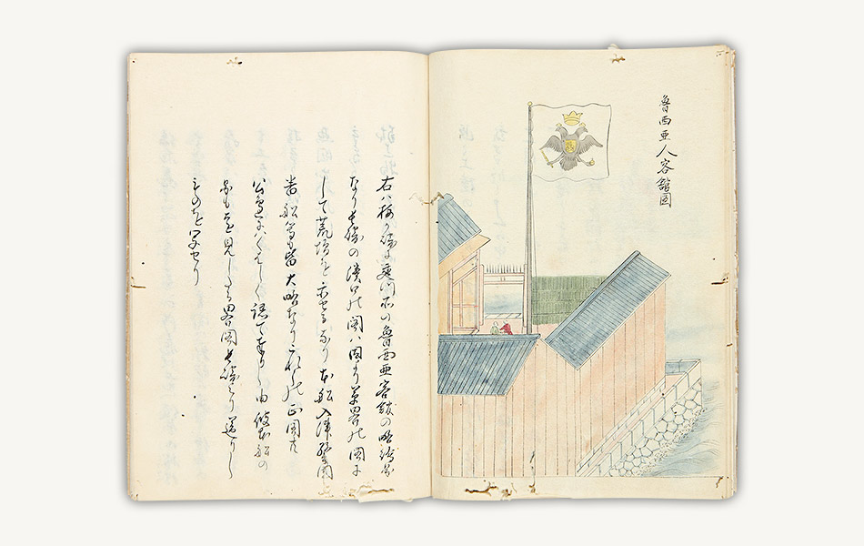 寛政5年(1793)11月に石巻港(宮城県石巻市)を出た津太夫の船は、翌年アリューシャン列島の島に漂着。ロシアに8ヶ年滞留したのち、ロシア残留を希望する6名を除く津太夫ら4名が、レザーノフに伴われて、世界周航をめざすクルーゼンシュテルン提督の船に乗り込みました。聖ペテルスブルグの外港を出帆した船は、大西洋を横断し、マゼラン海峡、ハワイ、カムチャッカを経て長崎に至りました。津太夫らは世界を船で一周したことになり、書名もこれに由来しています。本書はロシアの社会や風俗等を絵入りで紹介するほか、長崎における日露間のやりとりについても記しています。