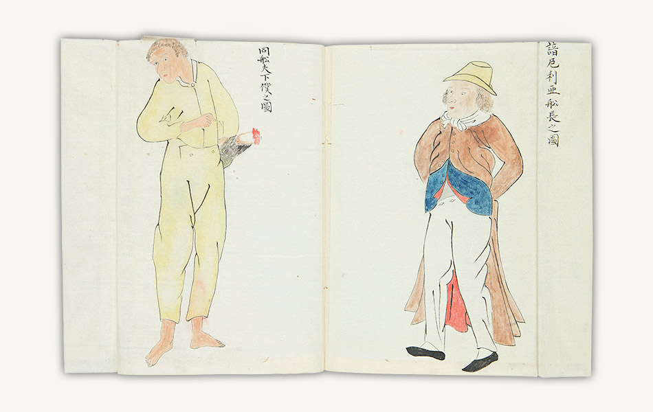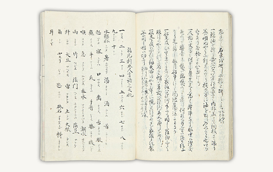 『視聴草』続二集の六には、文政5年(1822)4月29日、再びイギリスの船が浦賀に来航したときのことが記されています。またしても足立・馬場の両名が派遣され、オランダ語を解する乗務員から、同船が2年前に本国を出航した捕鯨船で、水、食料、薪を補給するために立ち寄ったことを聴き取ります。幕府の警戒は厳しく、白河、小田原、川越各藩に出動を命じ、多数の船で捕鯨船を囲みましたが、船内には鯨油のほか荷物はなく、薪水と食料そして「敗血病」治療用の「山土」(病んだ足を土中に漬けると快方に向かうというのです)など希望の品が手に入ると、捕鯨船は5月8日に浦賀を去りました。『視聴草』には、船内の捕鯨道具や乗組員の食器等の図のほか、「諳厄利亜人言語之大概(あんげりあじんげんごのたいがい)」と題してさまざまな英単語が紹介されています。