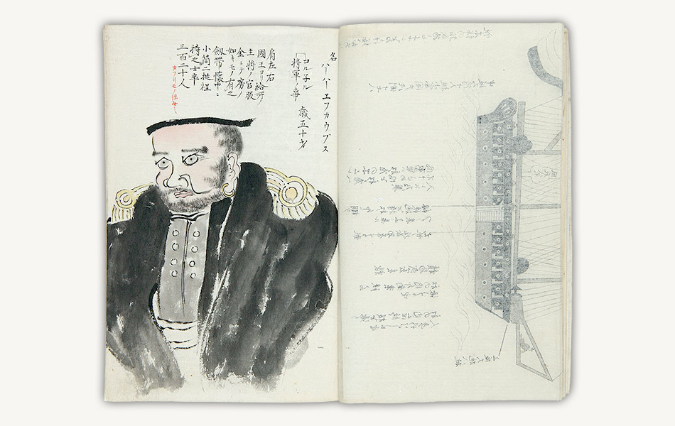 『視聴草』続八集の四は、「甲辰阿蘭舟到来(きのえたつおらんだせんとうらい)」と題してオランダ国王の開国勧告の記事を載せ、特使の肖像やオランダ船の図なども添えています。