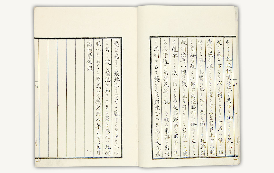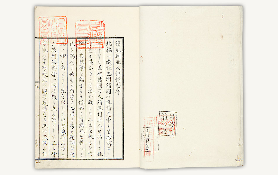 『諳厄利亜人性情志』は、高橋景保が吉雄忠次郎(よしおちゅうじろう 名は永宜。1787-1833)に訳させたイギリスの歴史と国民性に関する書。文政8年(1825)に書かれた序文で、景保は、イギリス人は「死を軽んじ己が為さんと欲する所誓て必果し」(目的のためには死をものともしない闘争的な)気性であると同時に、古くから国王たりとも背けぬ法典を整備し、「君臣上下の別ありと雖(いえど)も其(そ)の実は無か如(ごとく)」(身分階級の別は、あって無きがごとし)と、その国民性を要約しています。景保は何故このような書を和訳させたのか。理由は、当時頻繁に出没するイギリス船に対する危機感にほかなりませんでした。イギリスの脅威に対処するためには、まず彼らの国民性を知らなければ、というのです。