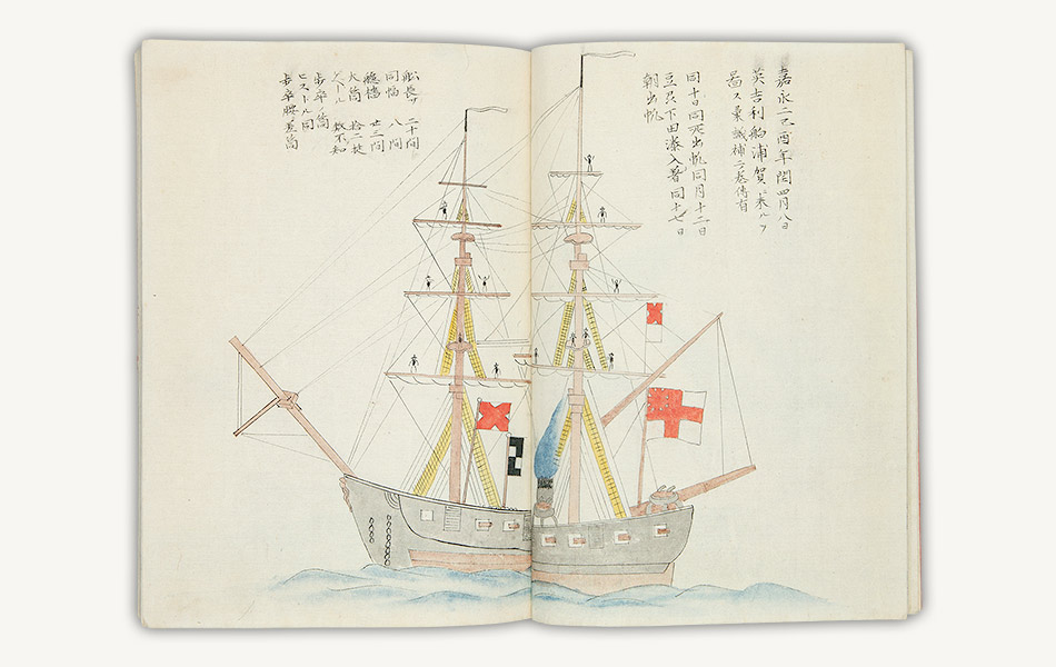 続編の別本(全3冊)には、嘉永2年(1849)閏4月に浦賀・下田に来航し、測量を行ったイギリスの軍艦マリナー号を描いた彩色図も見えます。
