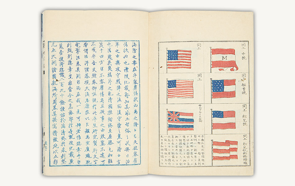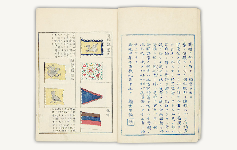 水戸の鱸奉卿(鈴木重時)が、清国から米利堅(アメリカ)まで、各国の国旗や艦船の旗など291種を彩色で示した図譜。嘉永5年(1852)序。各国の旗章を図示した当時もっとも詳細な刊行物で、著者はアへン戦争の情報に接して危機感をふくらませ、この図譜の作成を思い立ったということです。旗を見ただけでどこの国の船か即座に確認できる便利な1冊。水戸弘道館教官の森庸軒(もりようけん)は、後序で、本図譜を全国の海岸防備担当者必携の書であると推奨しています。全1冊。