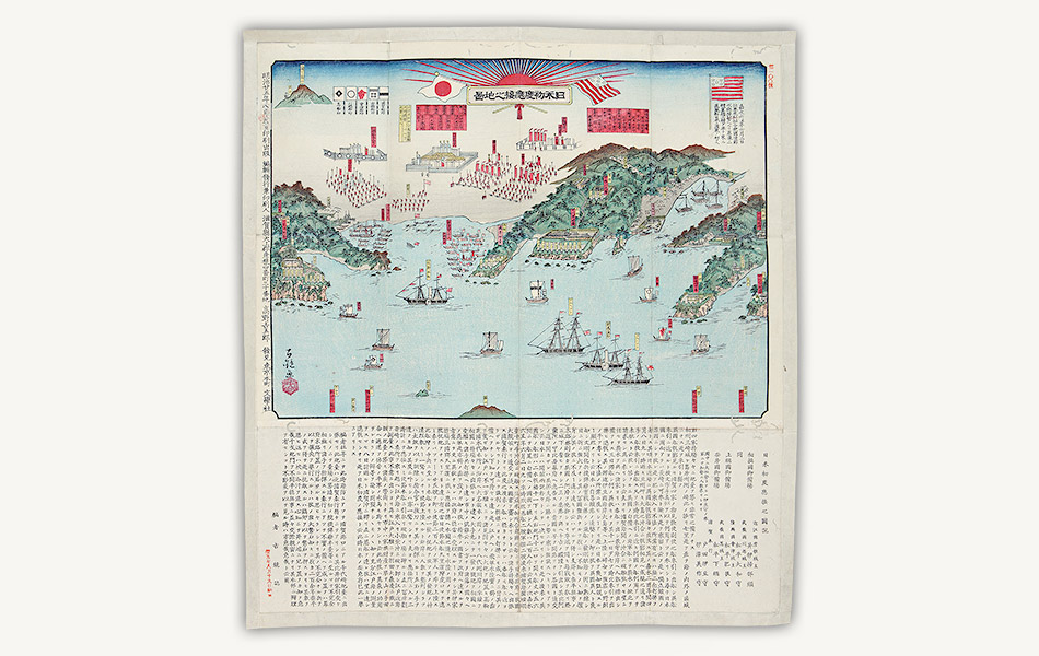 『日米初度応接之図説』は、嘉永6年6月9日の久里浜の様子を再現した図。国書の授受がなされた応接所とアメリカの艦船、それぞれの持ち場で彦根、川越、会津、忍(おし)藩の士が警備に当たっているところが描かれています。明治25年(1892)刊。絵図の編集兼発行人の高野吉五郎は、当日彦根藩の警備隊の一員として出張していた人で、その時の印象をこう述べています。―自分が出張したのは彦根藩が浦賀奉行所から引き受けた砲台だったが、台場の築造の具合から弾薬に至るまでお粗末そのもので、幕府の末路が思いやられたものだ―。全1枚。