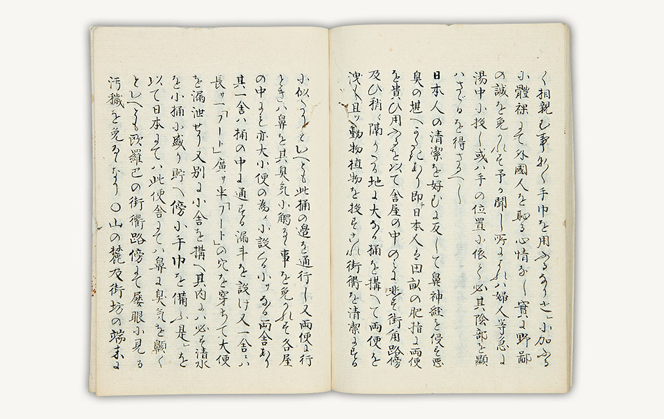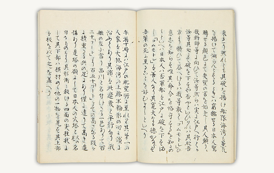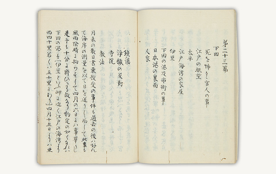 資料の『日本行記』はハイネの 『世界周航日本への旅』の日本語訳。オランダ語版を手に入れた幕府が、情報収集のため蕃書調所(ばんしょしらべしょ)(資料27参照)に命じて翻訳させたものです。全5冊。