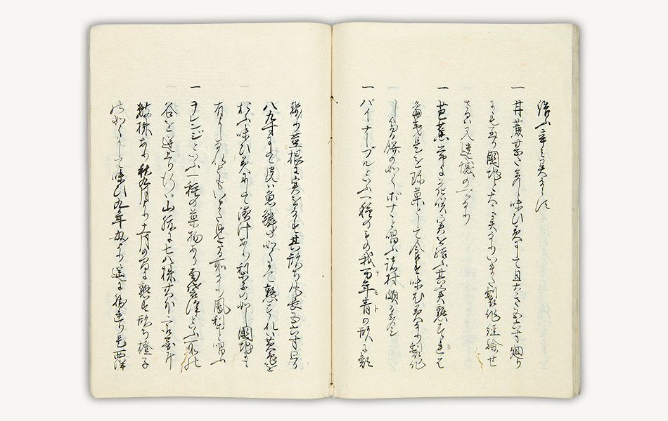 『小笠原島風土略記』は、小花が、「ボナナ」「パイナープル」ほか島の産物を紹介した書。あわせて中浜万次郎や平野廉蔵(越後の廻船問屋)を中心に小笠原近海で行われた洋式捕鯨についても触れられています。