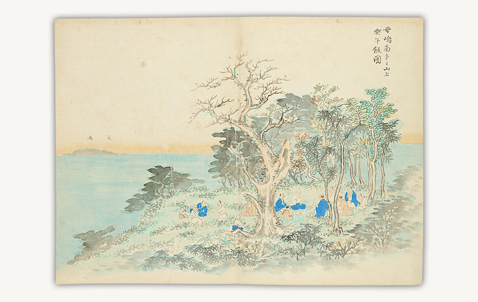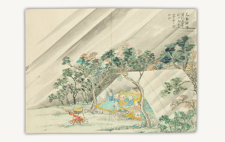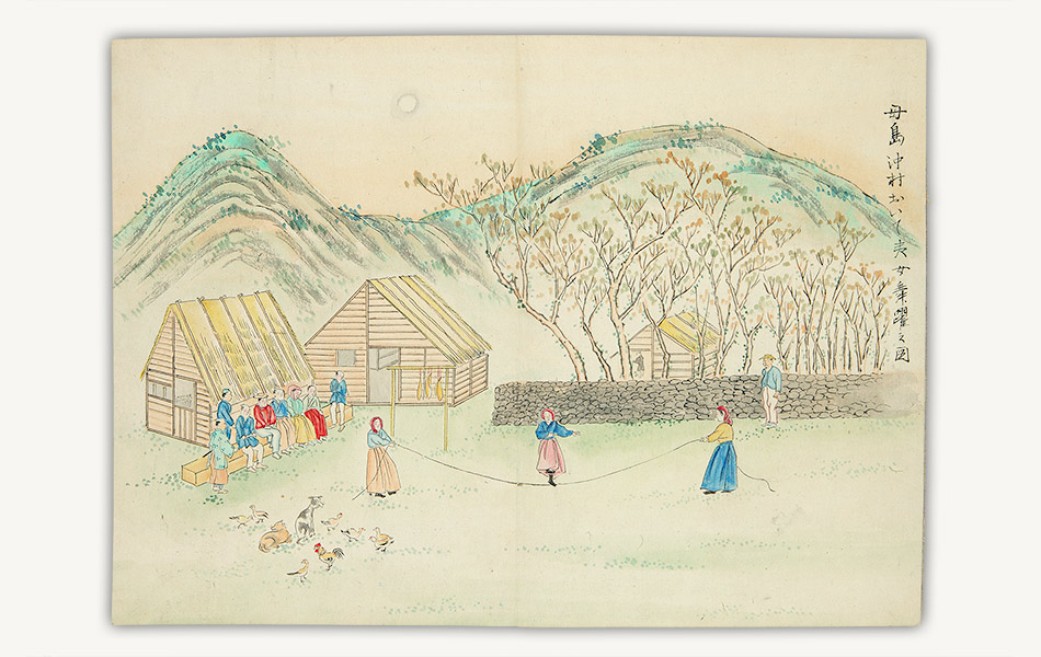 小笠原回収団に絵師兼医師として参加した宮本元道(みやもとげんどう 1824-?)が現地で描いた図をまとめたもの。水野忠徳は回収団の人選に当たって漢方医と蘭方医各1名の随行を希望しましたが、蘭方医として選ばれたのが、美濃大垣藩士で安政6年(1859)から絵図調出役として蕃書調所に出仕していた宮本でした。宮本は、小笠原の自然や島民の生活の様子、野宿しながら島内の測量や調査に当たる水野忠徳以下一行の姿を彩色図に描いています。彼の絵は『小笠原島真景図』と呼ばれ、資料はその模写と忠われます。全2帖。