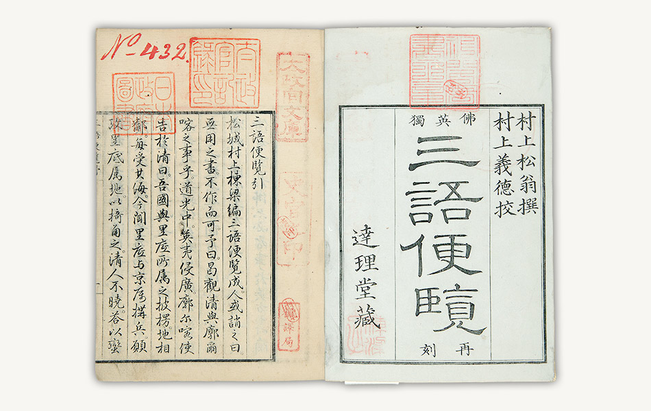 『三語便覧』は、フランス語・英語・ドイツ語の対照辞書。著者の村上英俊(むらかみひでとし 義茂、義隆とも。1811-90)は、10代で蘭学者の宇田川榕庵(うだがわようあん)に学んだのち松代藩医となり、佐久間象山(さくましょうざん)の勧めでフランス語を学び始めました。本書はその最初の成果。村上は幕府の蕃書調所に出仕し、明治元年(1868)に仏学塾「達理堂」を開いた、わが国のフランス語学者の草分けです。嘉永7年(1854)刊。全3冊。
