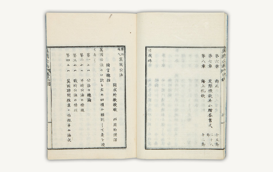 『畢洒林氏万国公法』は、文久2年(1862)、蕃書調所から津田真道(つだまみち)らと共にオランダに派遣された西周(にしあまね 周助。1829-97)が帰国後に翻訳した、ライデン大学教授フィッセリングの万国公法(国際法)の講義筆記です。「公法の総論」「平時泰西公法の条規」「戦時泰西公法の条規」「万国聘問往来の条規併に法式」の4巻から成り、全4冊。翻訳は慶応2年(1866)の末に完了し、同4年夏に刊行されています。西と津田が2年間受講したフィッセリングの講義は、性法(自然法)・万国公法・国法・経済・統計の5科目で、講義内容を書き記したノートが本書の「原本」であると、西は序文で述べています。