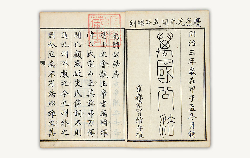 西周がフィッセリングの万国公法(国際法)を紹介するより早く、幕府(開成所)は別の経路から万国公法の文献を入手していました。中国で同治3年(1864)に『万国公法』が出版されると、直ちにこれを取り寄せ、翌年(慶応元年)、忠実に覆刻し、返り点や人名・地名の読み仮名を補って出版したのです。新刊本は将軍家茂に進献されたのち、江戸の書店を通して販売されました。