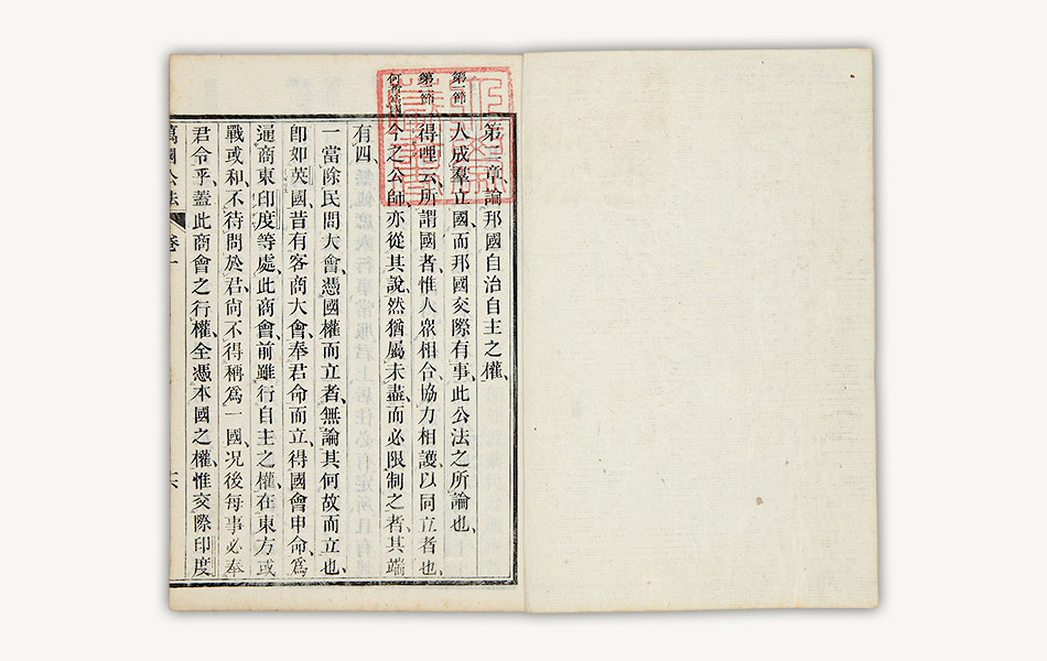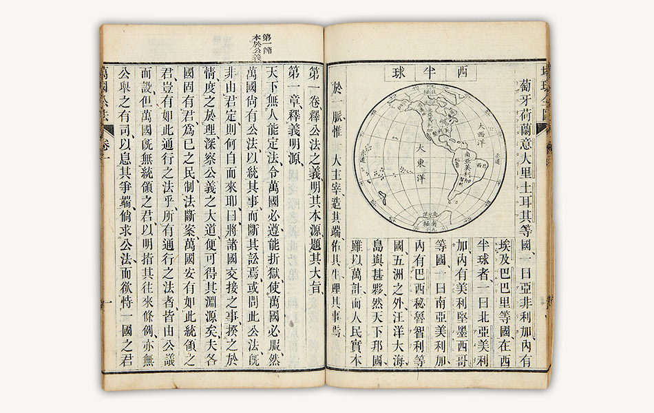 『万国公法』は、へンリー・ホウィートンが著した原書を、北京で活動していたアメリカ人宣教師のマーチンが漢訳したもの。万国公法というインターナショナル・ロウの訳語もマーチンによって造られました。