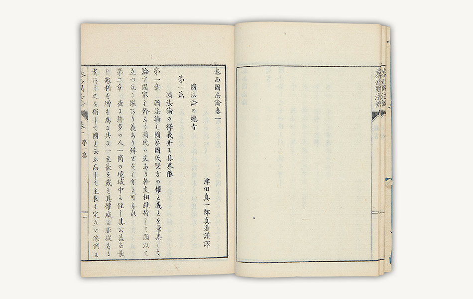 『泰西国法論』は、ライデン大学で西周とフィッセリングの授業を受けた津田真道(つだまみち 真一郎。1829-1903)が、帰国後、オランダ語で筆記した講義内容を訳したもの。慶応2年(1866)に稿が成り、同4年に開成所から出版されました。泰西国法とは西洋諸国の国内法のことで、さまざまな法と政治体制について解説し、国民の権利や宰相の責務、国の財政の改善法なども具体的に記されています。