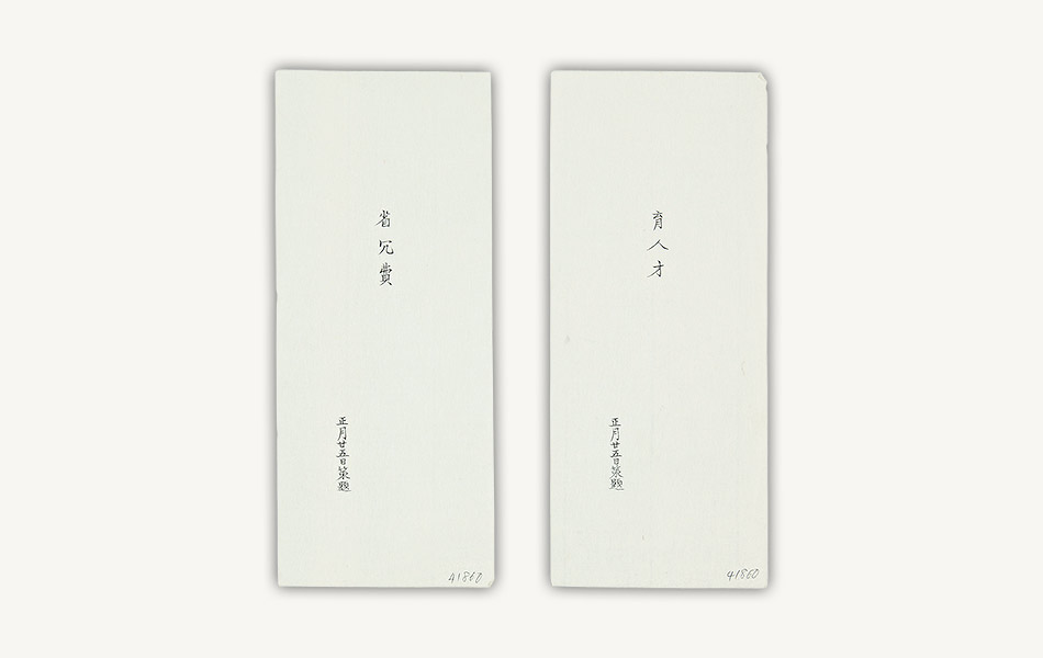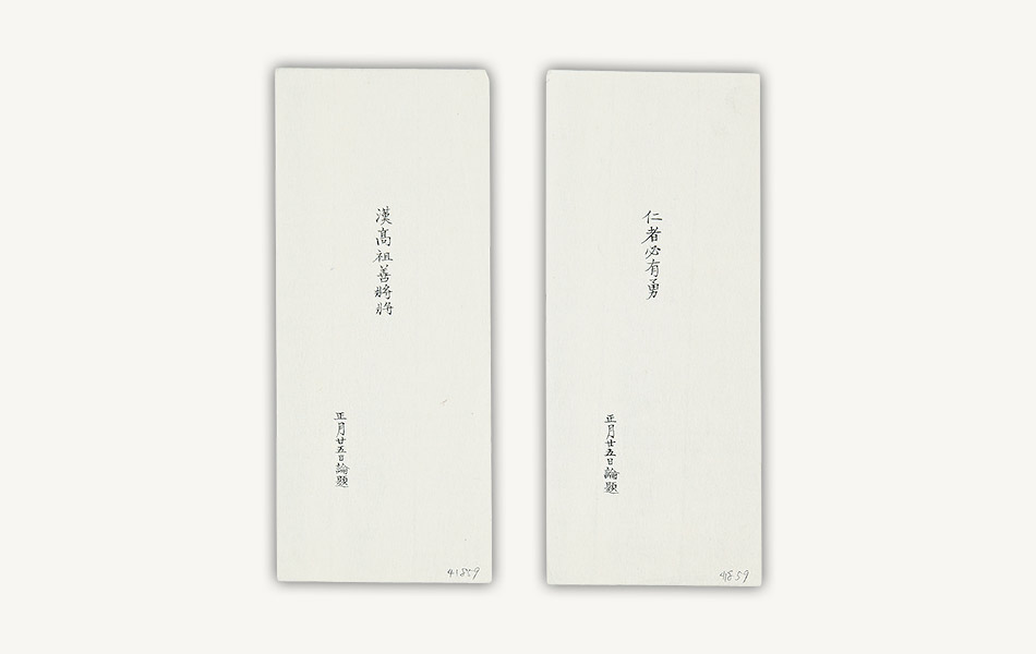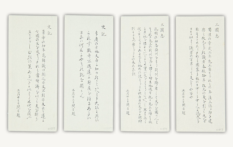 幕府の学問所では、幕臣の子弟を対象に定期的に学問吟味(学力試験)が実施され、成績優秀者には褒美が与えられました。資料は学問吟味の試験問題を記した紙片。通常は紙に包まれ、事前に漏洩しないよう封印が押されていたようです。問題は、中国古典の「和解題(わかいだい)」(和訳問題)、テーマを指定した「論題(ろんだい)」(論文問題)、課題に対する解決策を述べる「策題(さくだい)」、そして『史記』『三国志』等から出題される質問に答える「問目(もんもく)」等々。いずれも経史(儒学の経典や歴史書)の内容に精通していないと解けない問題です。