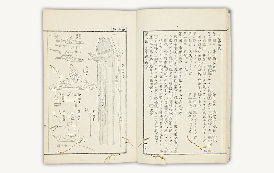 『遠西武器図略』は、市川がオランダのオーフルストラーテン著『砲術ハンドブック』(1850年刊)の付図と図解編を訳したもので、ペリー来航後まもない嘉永6年(1853)9月の刊。カノン砲・歩兵銃・ピストル等の精密な図が掲載されています。全1冊。