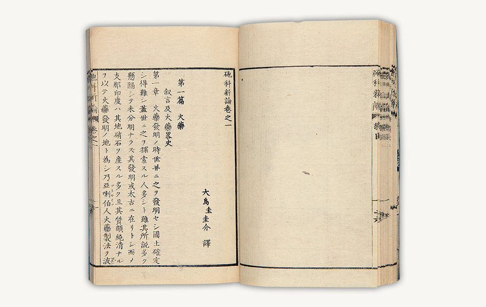 幕府の歩兵を引き連れてフランス式陸軍演習に参加し、幕府倒壊後も主戦論を唱えて箱館の五稜郭で戦った大鳥圭介(おおとりけいすけ 1833-1911)も、オーフルストラーテンの著作を翻訳しています。文久元年(1861)に刊行された『砲科新論』がそれ。火薬の成分と製法、銃砲の鋳造法などが詳しく紹介されています。