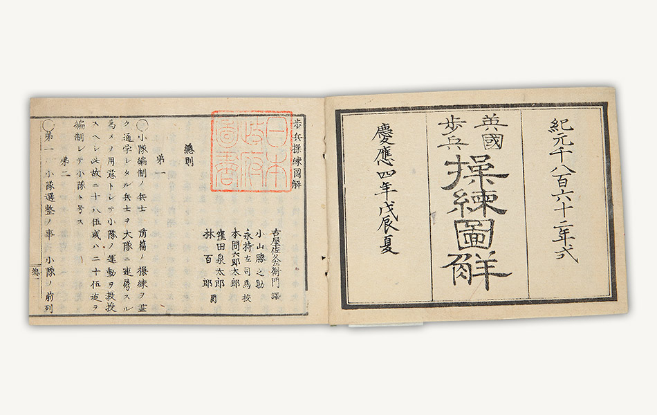 幕末には、オランダ・イギリス・フランス各国の歩兵操典(歩兵の訓練法や戦法の基本を記した書)が翻訳刊行されましたが、資料はいずれもイギリス歩兵操典の翻訳書。『歩兵令詞』は、令詞(号令)の部を訳したもので、幕府陸軍の銃隊方で訳し、慶応3年(1867)に刊行されました。全3冊。『英国歩兵操練図解』は、英語に堪能で、横浜でイギリス人から用兵術を学んだ経験がある古屋佐久左衛門(ふるやさくざえもん 1833-69)の訳で、慶応4年(1868)刊。全2冊。歩兵隊の行進の仕方や各種編成について略図入りで解説しています。