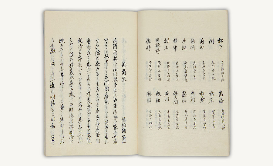 『藩翰譜』は、徳川綱豊(甲府藩主 のちに6代将軍徳川家宣)の命で新井白石(1657―1725)が著した万石以上の諸大名337の家伝集。慶長5年(1600 関ヶ原の戦の年)から延宝8年(1680 4代将軍家綱の没年)まで、81年間の事跡が記されています。元禄14年7月に起稿され、「百年の精力此時に半を尽し畢(おわん)ぬ」(『新井白石日記』)という苦心の末、10月に脱稿。元禄15年(1702)2月に清書本が呈上され、綱豊によって『藩翰譜』の書名が与えられました。
