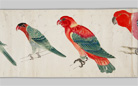 『風鳥喑呼類』は、風鳥(極楽鳥)とインコの彩色図。文政13年(1830)頃の成立か。奧に「翫砢翁 武蔵石壽」の署名と、「竹石主人武蔵吉恵印」の朱印があり(別に「武蔵石寿庫中」の朱印も)、石寿の蔵書であったことがわかります。全1軸。