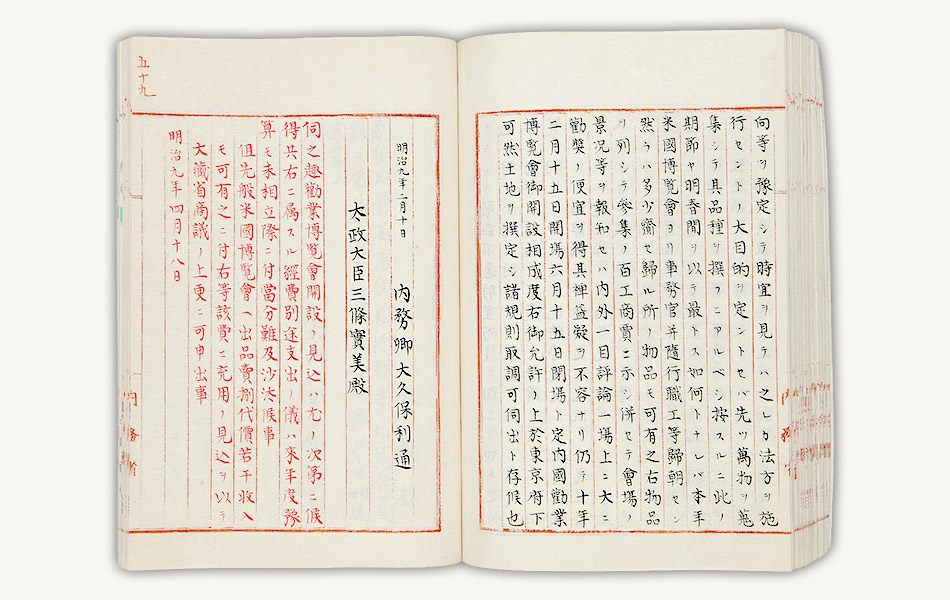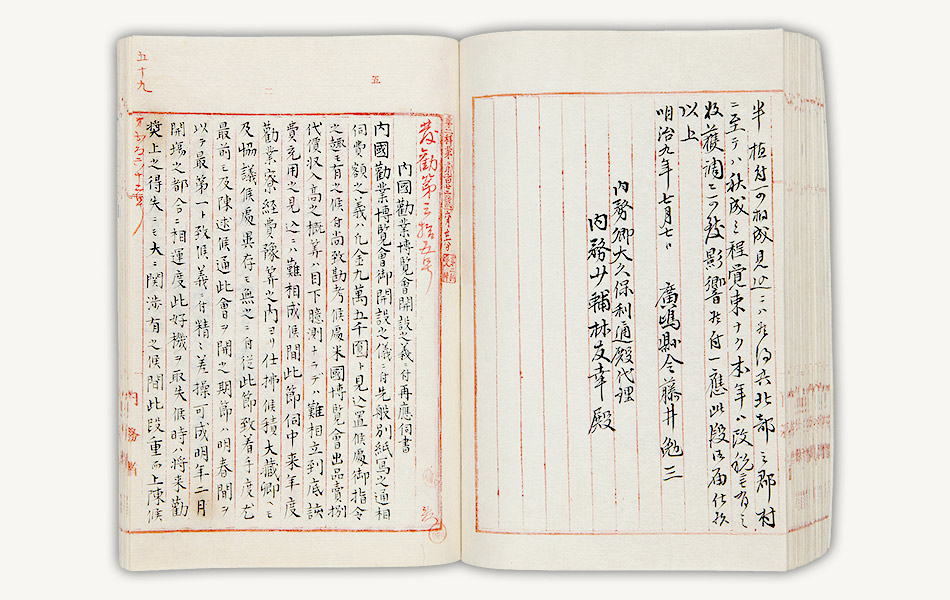 資料は、明治9年(1876)6月に内務省が提出した第1回内国勧業博覧会開催準備着手の伺書などです。