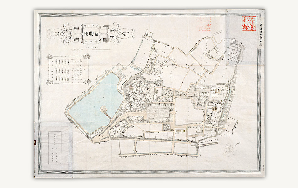 明治6年(1873)3月、上野は東京府により公園に指定されました。明治9年(1876)5月、上野公園は内務省博物局所属公園となりました。資料は、明治11年(1878)3月に内務省博物局が太政官に提出した上野公園地の実測図です。
