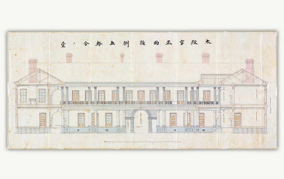 明治10年(1877)8月、太政官を赤坂皇居内に移転することが決まりました。さらに、翌11年(1878)6月、木造洋館式2階建ての太政官庁舎が仮皇居内に新築されました。資料は、明治10年(1877)9月に工部省が太政官庁舎新築の伺書を提出した際の附属図面です。