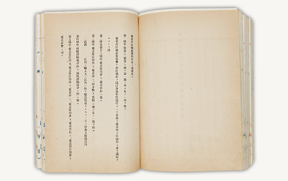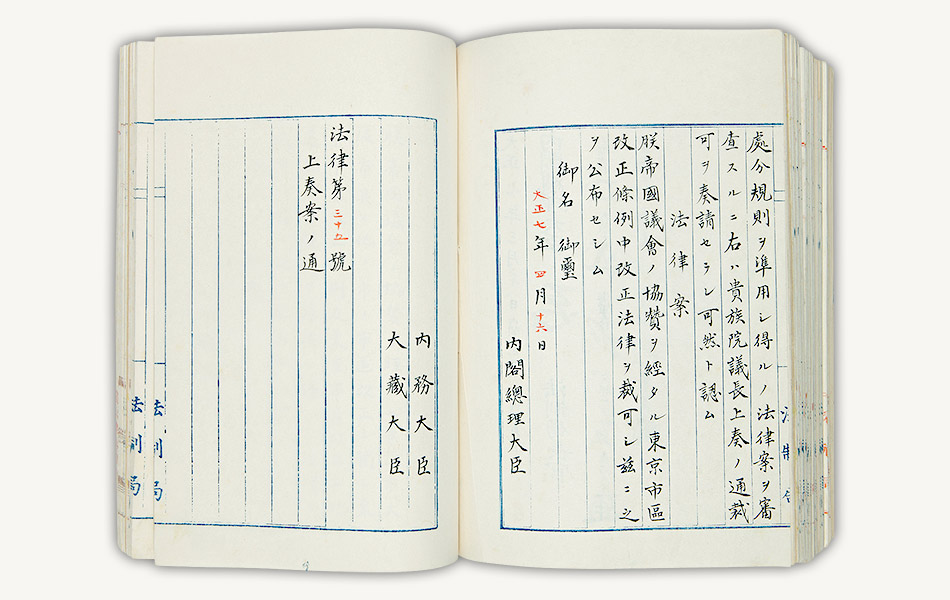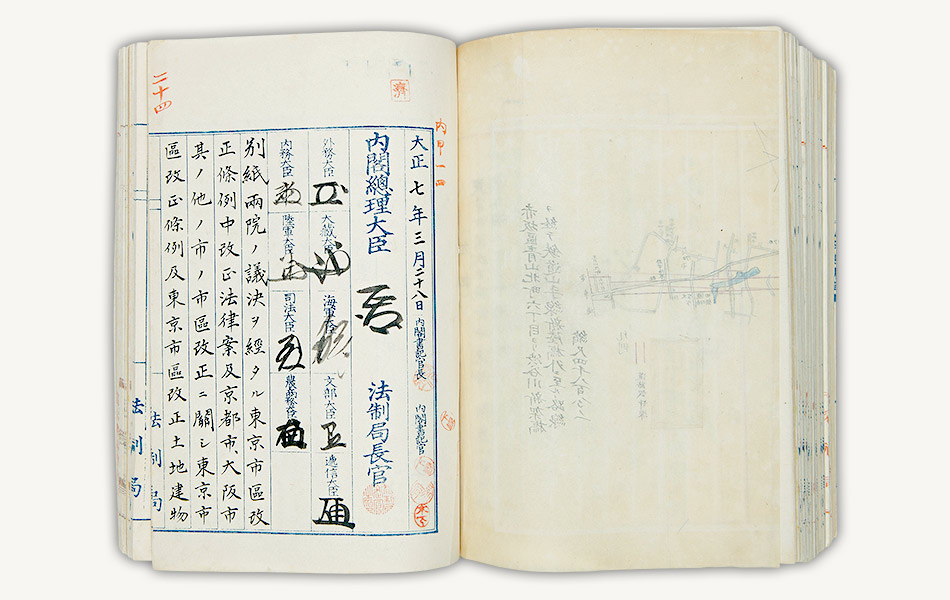 当面、東京市区改正条例を右の5都市にも準用することとなり、大正7年(1918)4月、そのための法律が公布されました。資料はその法律を公布する際の閣議書です。