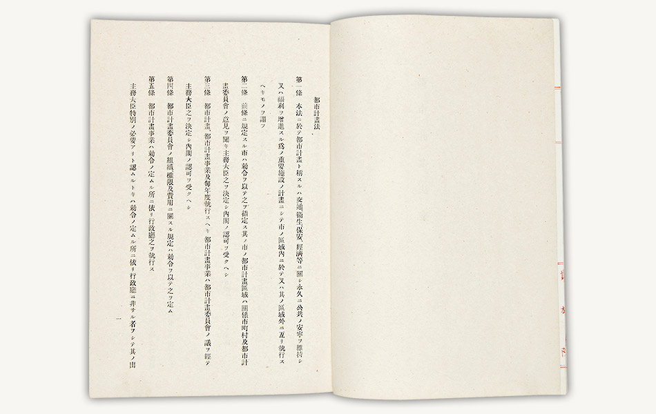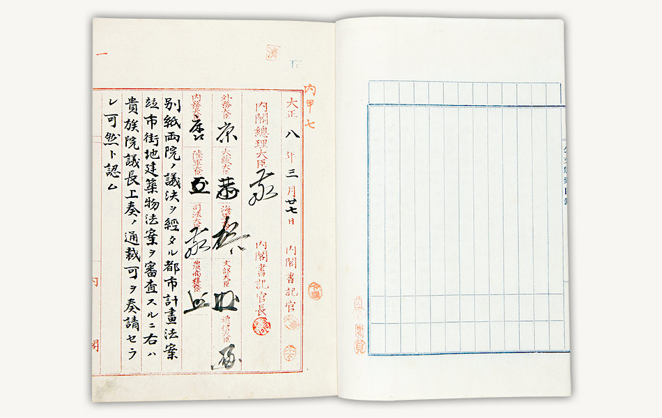 大正8年(1919)4月、都市計画法と市街地建築物法が公布され、翌9年(1920)から施行されました。資料は両法公布の閣議書です。