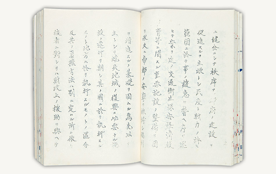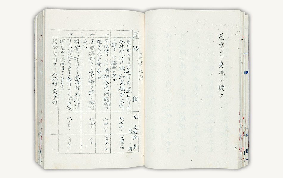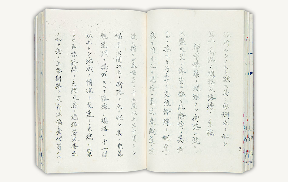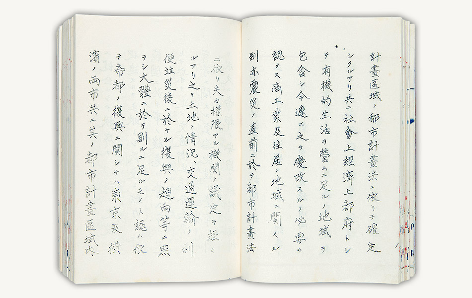 「帝都復興」の計画は、後藤新平帝都復興院総裁の下で、立案されました。当初理想案として作成したものは、事業費が40億円以上に達するものでしたが、内部の検討や大蔵省との折衝を経て7億円ほどにまで圧縮された案が閣議で決定され、帝都復興審議会に諮問されました。資料は、帝都復興審議会に諮問された大綱案です。