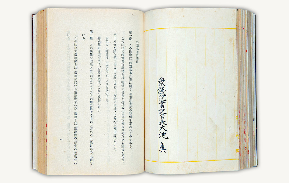 昭和21年(1946)9月、戦災復興事業を迅速かつ徹底して行うため、特別都市計画法が制定されました。同法に基づき、戦時中空襲による被害を受けた都市200あまりのうち、特に被害が大きかった115都市が、特別都市計画を行う都市として指定を受けました。東京では、区の存する区域と八王子市が指定されました。