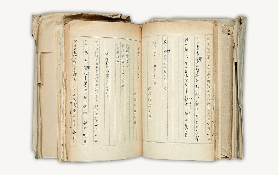 昭和29年(1954)4月1日、北多摩郡の府中町と西府・多摩両村とが合併し、府中市が誕生しました。資料は、その際の総理府告示と各省大臣等宛通知の決裁文書です。