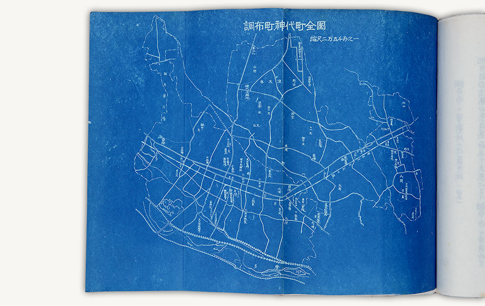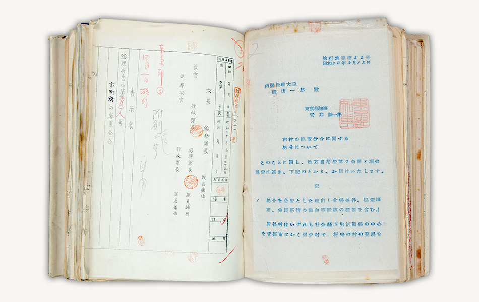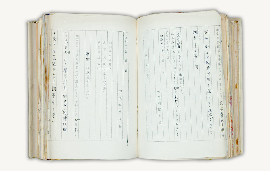 昭和30年(1955)4月1日、東京都北多摩郡調布町と神代町が合併し、調布市が誕生しました。その際の総理府告示と各省大臣等宛通知の決裁文書には、調布・神代両町から東京都に提出された申請書が添付されています。資料は、添付文書に含まれている「調布町・神代町全図」です。
