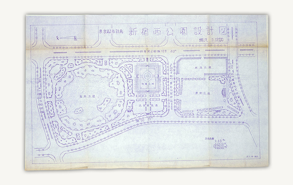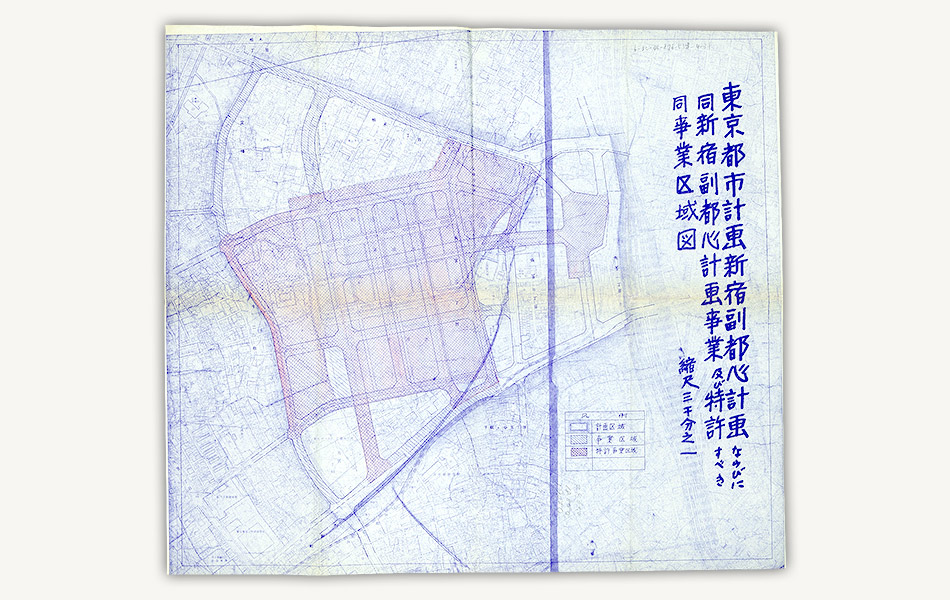 昭和31年(1956)公布の首都圏整備法に基づき設置された首都圏整備委員会は、昭和35年(1960)1月新宿副都心計画を決定しました。同年6月、新宿副都心計画が都市計画決定され、副都心建設事業を執行するために財団法人新宿副都心建設公社が設立されました。資料は、同公社に新宿副都心計画事業の執行について、建設大臣が特許を与えた際の特許申請書の添付図面です。