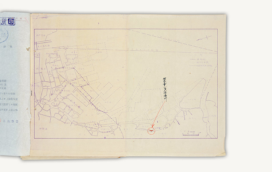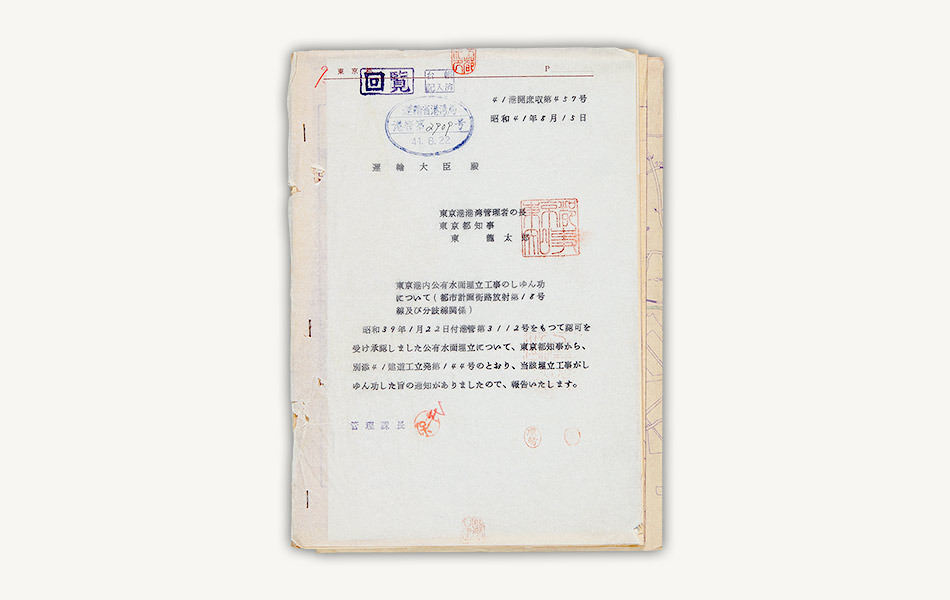 資料は、昭和41年(1966)8月に、都市計画街路放射第18号線及び分岐線関係の東京港内公有水面埋立工事の竣功について、東京都が運輸省に報告した文書です。東京都品川区大井勝島町13番地地先公有水面約1万7000平方メートルが埋め立てられました。