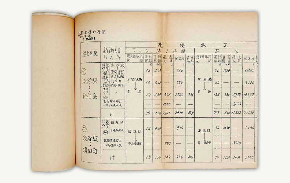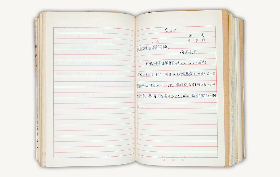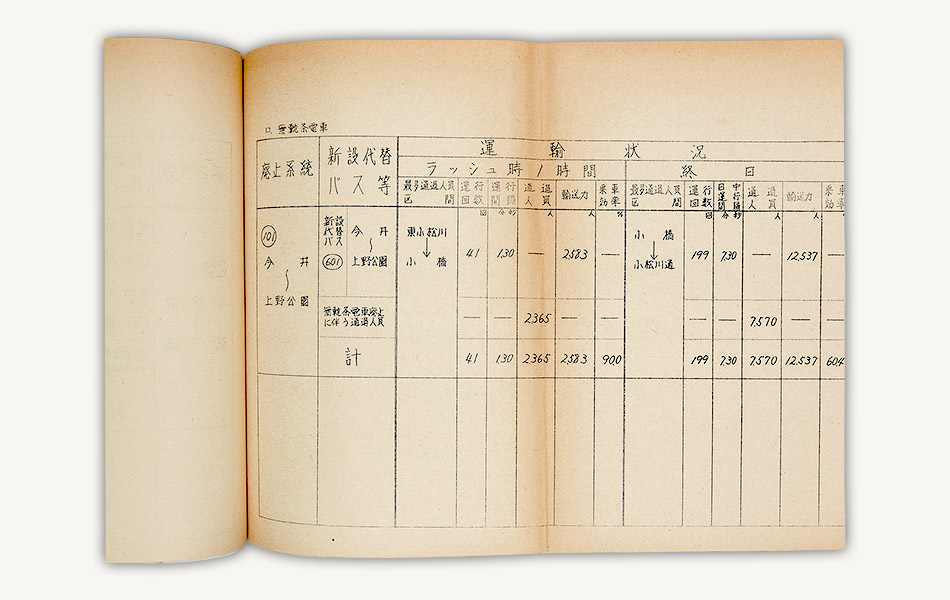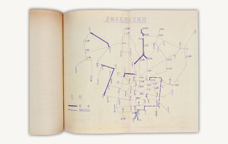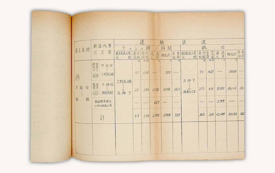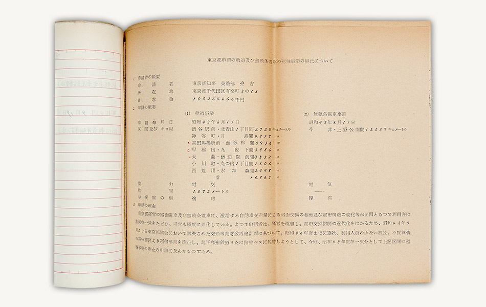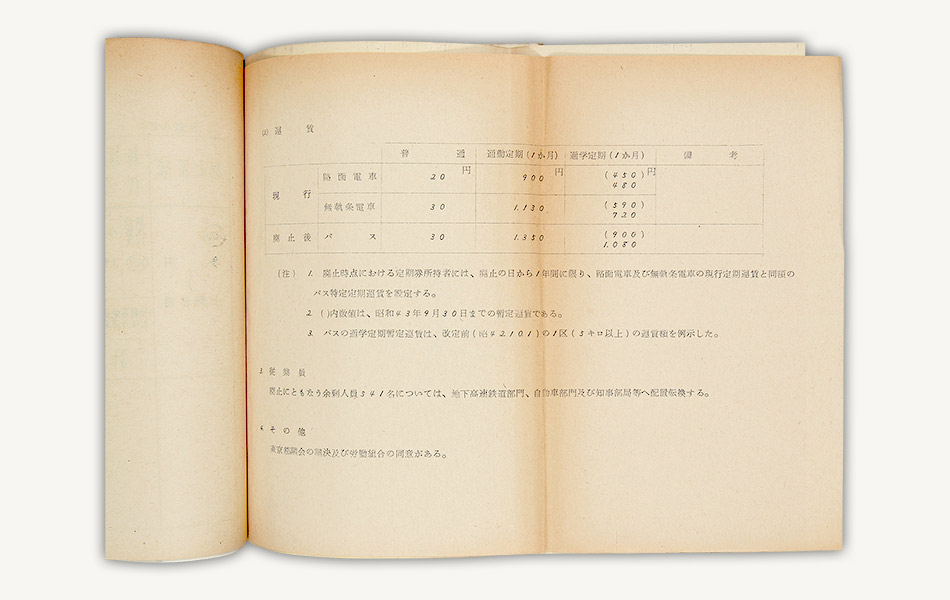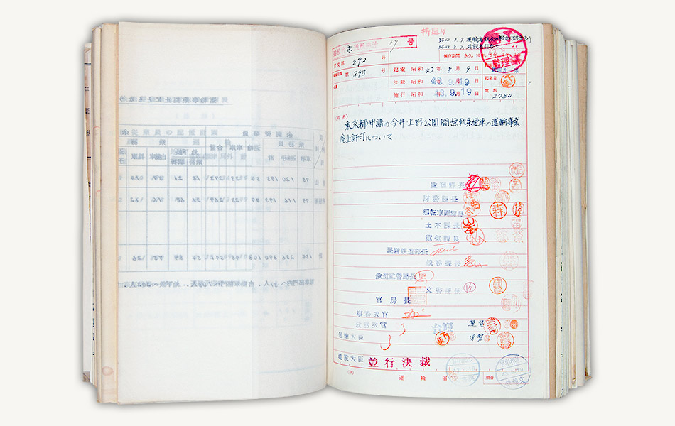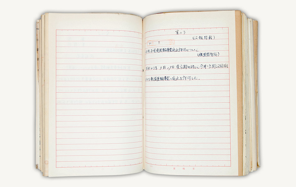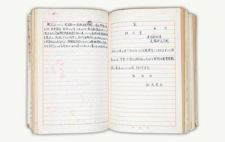 資料は昭和43年(1968)9月、上野公園、今井間のトロリーバス路線の廃止を許可した際の運輸省の決裁文書です。同路線の廃止により、東京交通局のトロリーバスは全廃されました。