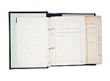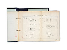 展示資料は、昭和45年(1970)に制定された「文部省記録文書分類表」です。「B.学校教育」の「0.法令」にあたる部分を見てみると、さらに細かい対照表になっていることがわかります。例えば、縦軸の「4.学校教育の振興」と横軸の「6.」が交わる部分には、「へき地教育振興法」とあります。これらのアルファベットと数字をつないだ「B/0/4/6」が、そのまま簿冊の背表紙に反映されています。