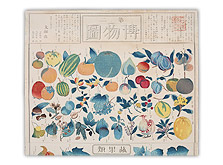 ウィルソンらによって作成された教材は、日本の教育現場において積極的に取り入れられました。例えば、先の掛図と類似した図が、文部省編『小学入門』にも掲載されています。並べて展示している「博物図」は、明治6年に文部省によって刊行されたものですが、上述した掛図の“Botany”(植物)を参考にしたと考えられます。絵の上部には解説が書かれており、果物などの保存方法や食べ方について言及されています。