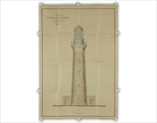 「犬吠埼灯台立体図」は、今も千葉県銚子市に現存する犬吠埼灯台の建設時の図面です。 犬吠埼灯台は、日本で24番目の洋式灯台として、イギリス人技師R.H.ブラントンによって設計され、明治5年(1872)9月28日に着工、明治7年(1874)11月15日より点灯しました。灯台の高さは31.5m、その建設には、灯明番の住居と共に国産レンガ19万3千枚が使用されました。