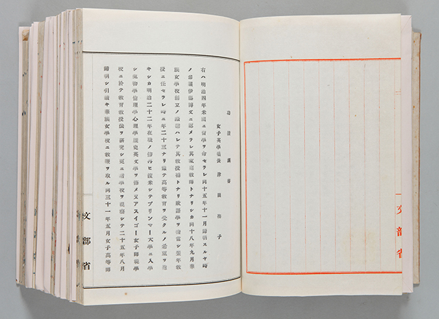 掲載資料は、昭和3年(1928)、津田梅子が勲五等瑞宝章を受章したときの文書です。文中には、2度にわたる留学を経て、明治33年女子英学塾を開設し、同36年には専門学校へと発展させたこと、また関東大震災に被災するも「毫モ屈スルコトナク直ニ仮校舎ヲ建設シ授業ヲ継続」したことなど、女子教育に従事し、英語普及に尽くした45年の功績が顕著であると記されています。