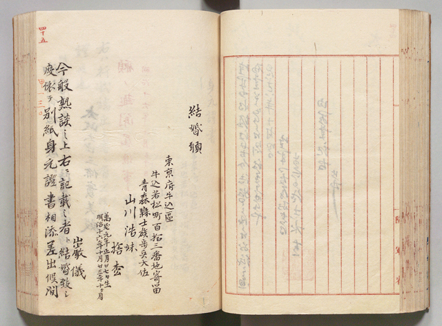 掲載資料は明治16年10月、山川捨松との結婚に際して、陸軍中将であった大山巌が提出した結婚願です。当時、陸軍武官結婚条例で、勅任官が結婚する場合には勅許を得ることが定められていました。山川が留学で培った語学と知識は、「 鹿鳴館外交」と呼ばれる社交の場で発揮されることになります。