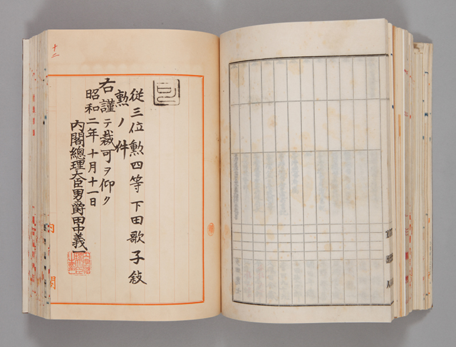 掲載資料は昭和2年(1927)、下田歌子が勲三等瑞宝章を受けた時の文書です。明治26年から同28年にかけての欧米視察で、「将来国家ノ中堅トシテ有為有能ナル婦女子ヲ養成スル教育機関ノ必要ヲ痛感」し、実践女学校を創設したことなど、女子教育の充実に取り組んだ功績が記されています。