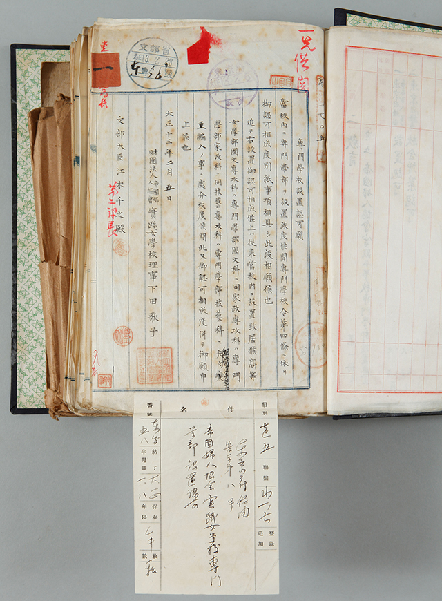 掲載資料は、大正13年(1924)、実践女子専門学校設立について、文部省へ提出した申請書です。明治41年の実践女学校創立時に、高等専門学部として家政科・技芸科を合わせて設置し、大正9年には、就業年限3年の高等専門部(国文・家政・技芸の3専攻)に改組した経緯等が記述されています。