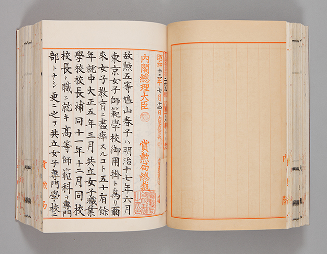 掲載資料は昭和13年、死去に際し、鳩山に勲四等瑞宝章が授与されたときの文書です。東京女子師範学校御用掛に始まり、教育に尽くした鳩山の50年以上にも及ぶ活動のうちでも、特筆すべきこととして共立女子専門学校・同高等女学校の設立、昭和13年に新校舎や講堂を竣工させ、今日の発展をもたらしたこと、各種団体の活動や著作物を通して女子教育界への功績が顕著なことなどが記されています。