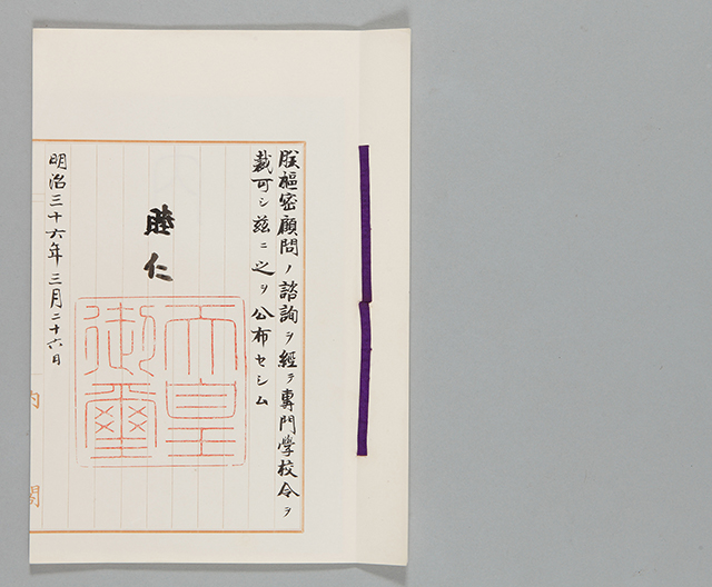 明治36年に公布された専門学校令の公布原本です。これにより高等教育機関に関する統一的な法制度が整備されました。第5条に「中学校若ハ修業年限四箇年以上ノ高等女学校ヲ卒業シタル者」とその入学資格が定められています。この専門学校令により、医学の分野でも、医学専門学校が設置されました。