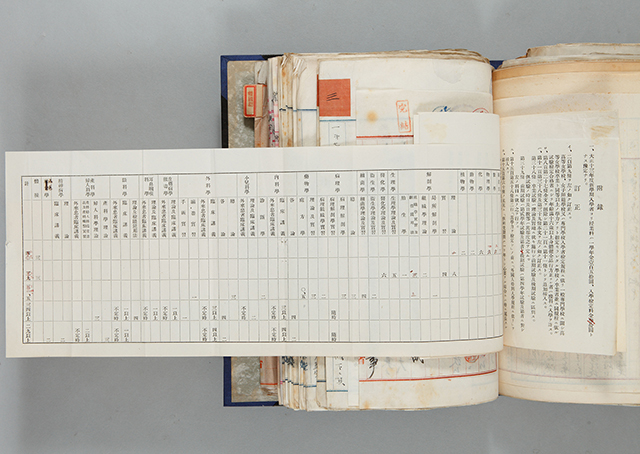 掲載資料は大正13年(1924)当時の「東京女子医学専門学校学則」に綴られた「学科課程表」です。同校で履修する科目と時間数等が記載されています。同校は大正9年、医師法による文部大臣の指定校となったことから、「卒業生ハ無試験開業ノ特権」がありました。