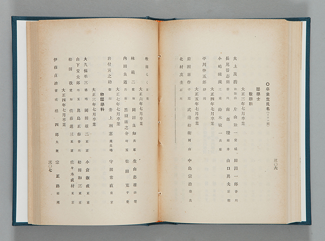 掲載資料は、大正8年に刊行された東北帝国大学理科大学、医科大学の学校案内です。卒業者の一覧には、黒田とともに入学した丹下、牧田の名前も見えます。