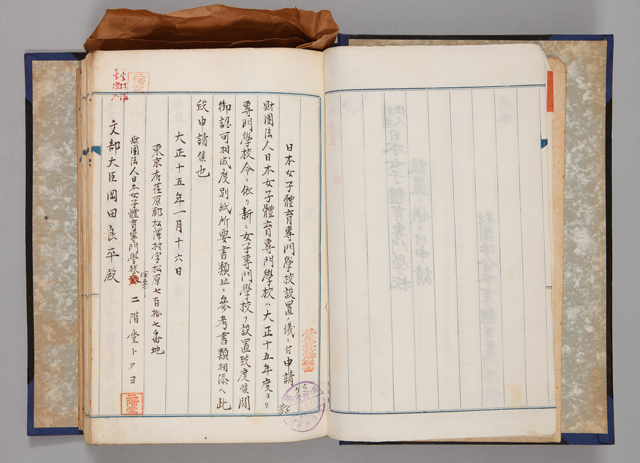 掲載資料は大正15年、二階堂が日本女子体育専門学校設立のために提出した認可願です。体育理論の教育や体操科教員の養成など、学校設立の目的が記されています。