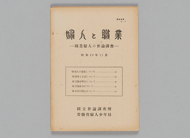 昭和24年に国立世論調査所と婦人少年局の連名で「婦人と職業」という調査報告書を刊行し、働く女性が高い意識を持って職業に就き、男女平等を実現することを求めました。この調査は、女性参政権の実現や日本国憲法の発布など、昭和23年までの様々な戦後の改革が女性にどのような意識の変革をもたらしたかを調査したものです。