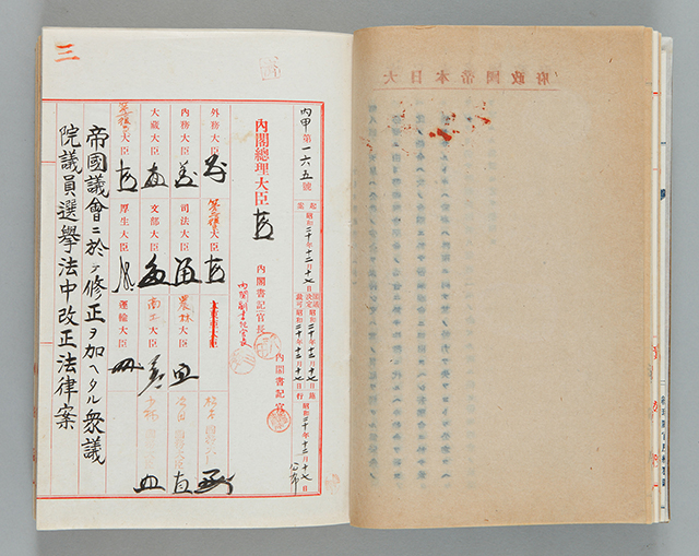 掲載資料は、昭和20年12月に衆議院議員選挙法の改正公布について閣議に付された際の文書です。第5条では「帝国臣民にして年齢二十年以上の者は選挙権を有す」、「帝国臣民にして年齢二十五年以上の者は被選挙権を有す」とあり、性別に関係なく、一定年齢以上の日本国民に選挙権、被選挙権が与えられることとなりました。