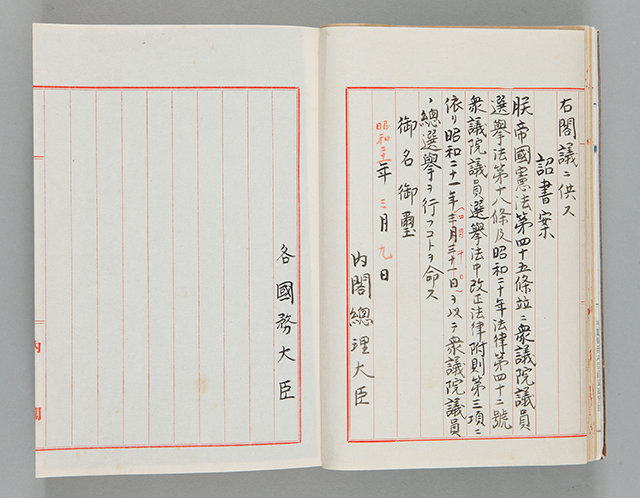 掲載資料は、第22回衆議院議員選挙を昭和21年4月10日に行うことについての詔書案を閣議決定した際の文書です。
