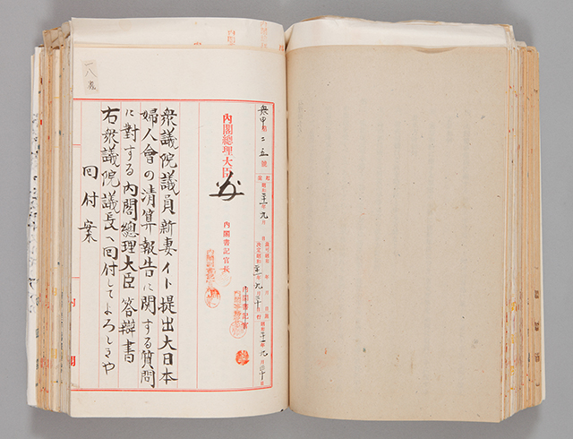 第22回衆議院総選挙で当選した女性議員の1人であった新妻イト(1890~1963)は、大日本婦人会の清算報告について、議会で質問をおこないました。掲載資料は、新妻の質問に対する内閣総理大臣からの答弁書を衆議院へ回付した際の文書です。
